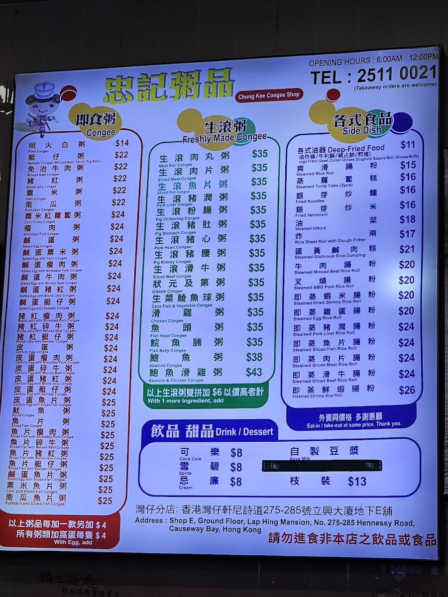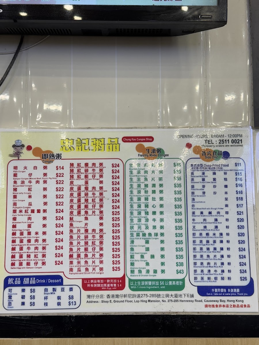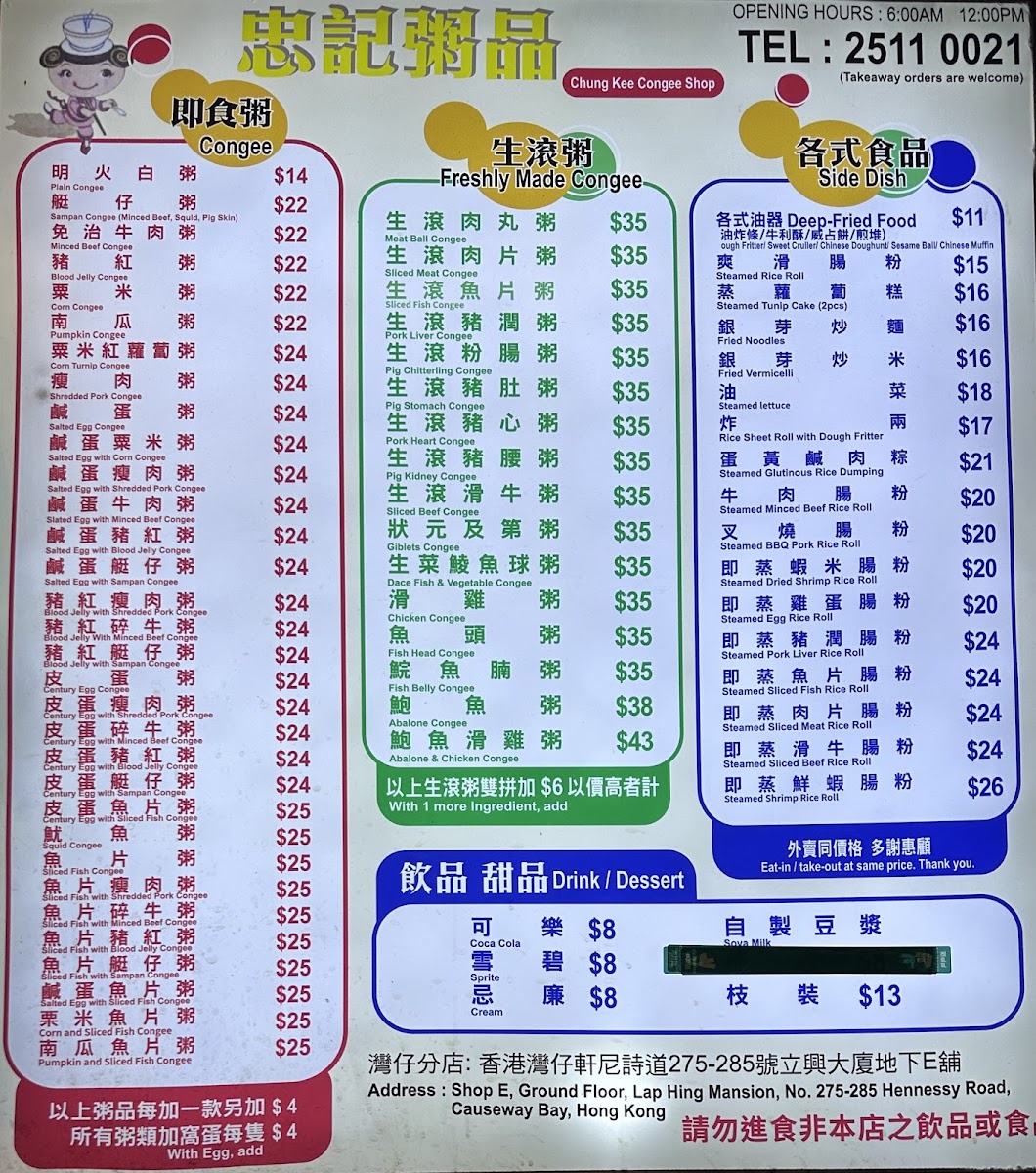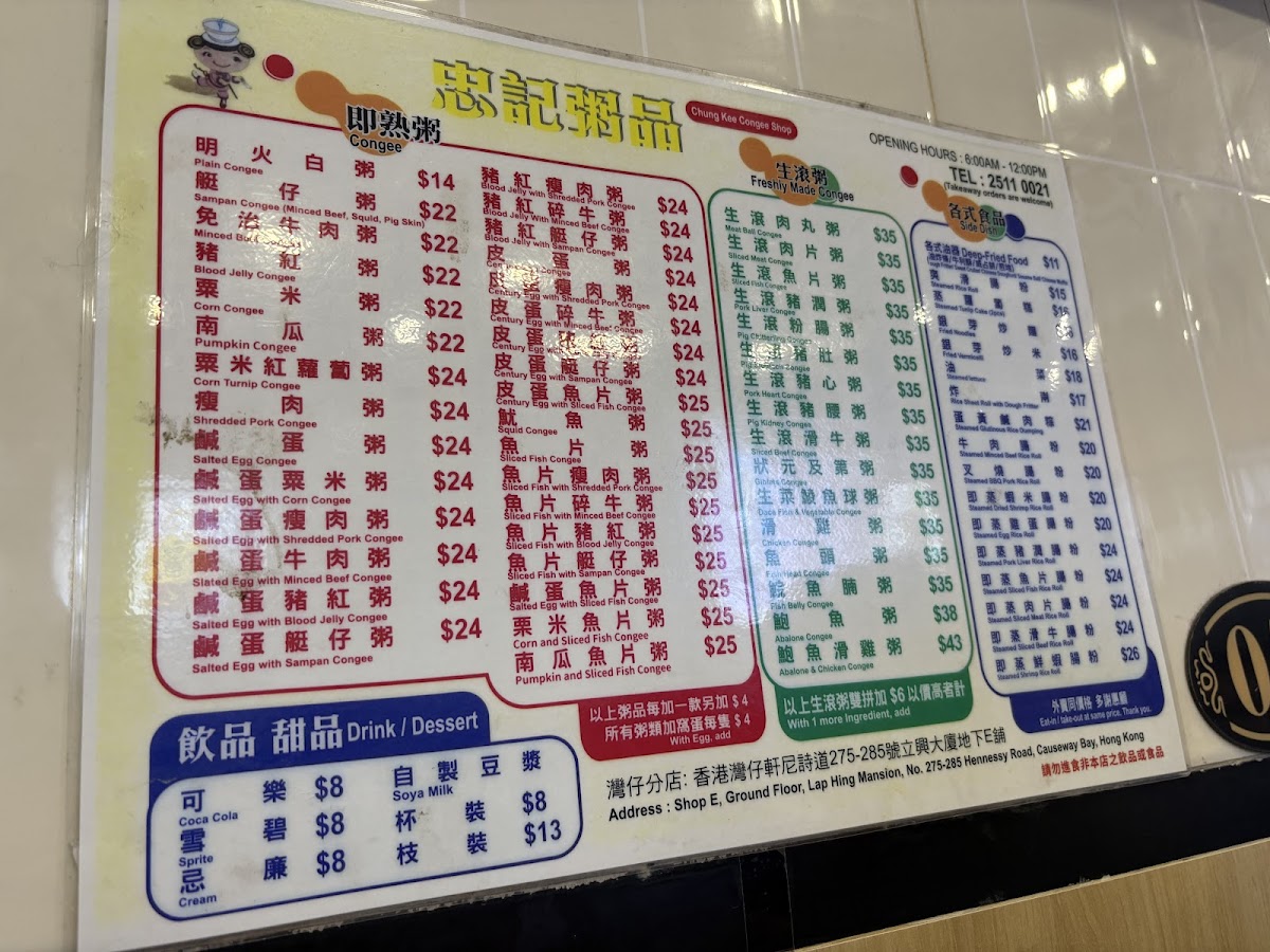 Chung Kee Congee Menu