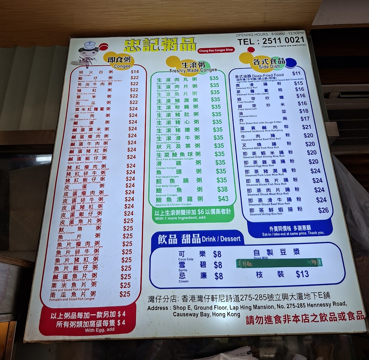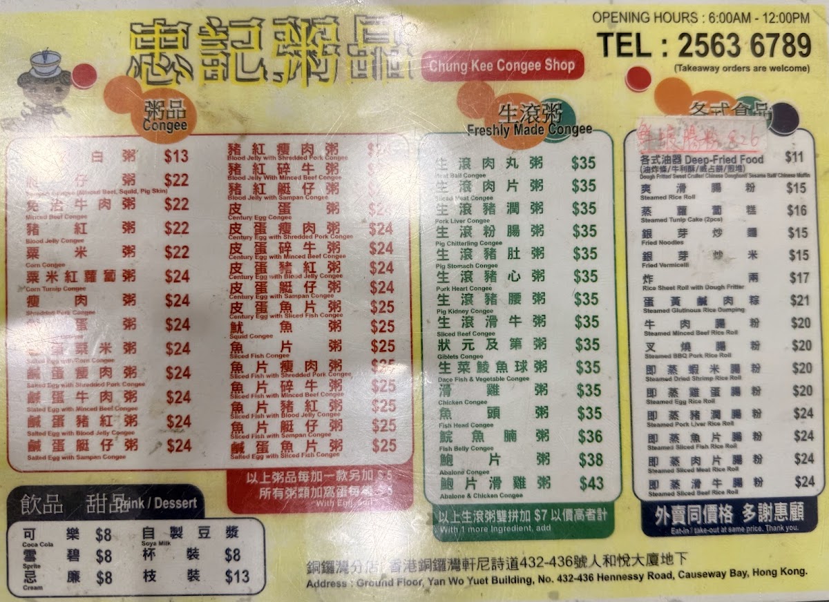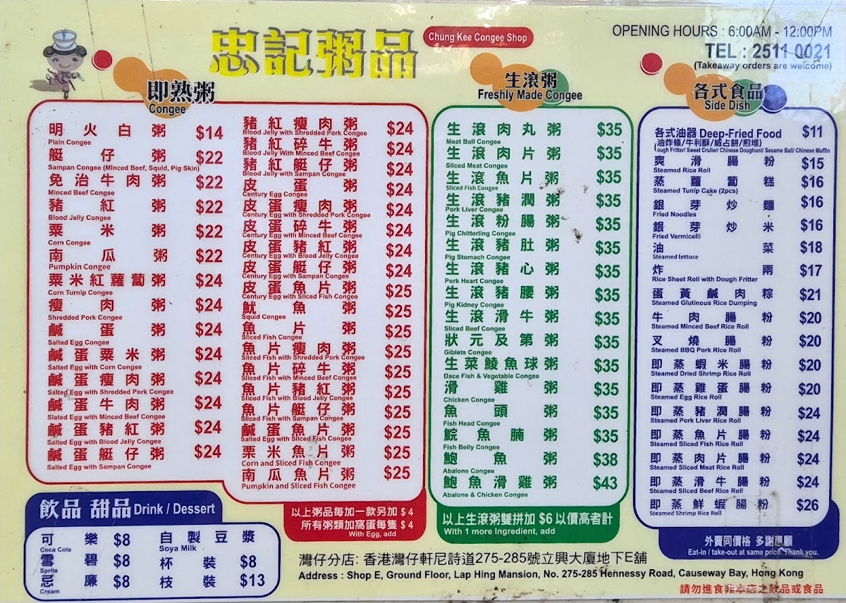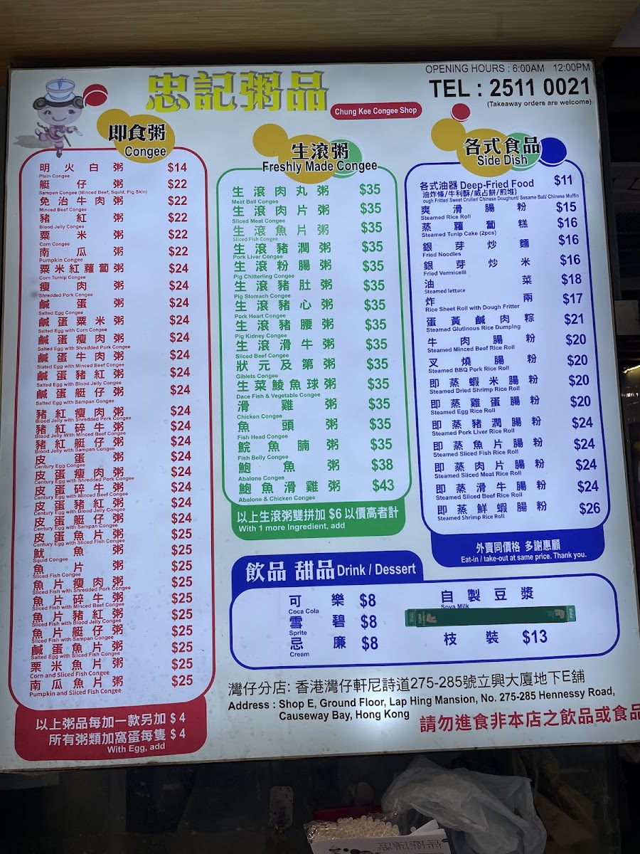 Chung Kee Congee Menu